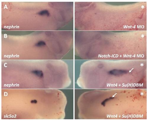 Fig. 4. wnt4 acts downstream of the Notch pathway in the pronephros. (A-D) X. laevis embryos were injected as previously described and left to develop to stage 32, when in situ hybridisation detecting expression of nephrin and slc5a2 was performed. (A) Knockdown of wnt4 translation using a MO-inhibited nephrin expression. (B) Co-injection of notch-ICD mRNA and the wnt4 MO also reduces nephrin expression. Co-injection of su(H)DBM mRNA with wnt4 mRNA, causes ectopic glomus formation (white arrow, C) and proximal tubulogenesis (white arrow, D). Asterisk denotes injected side. |