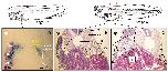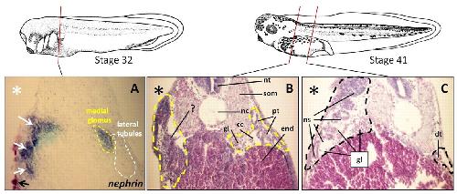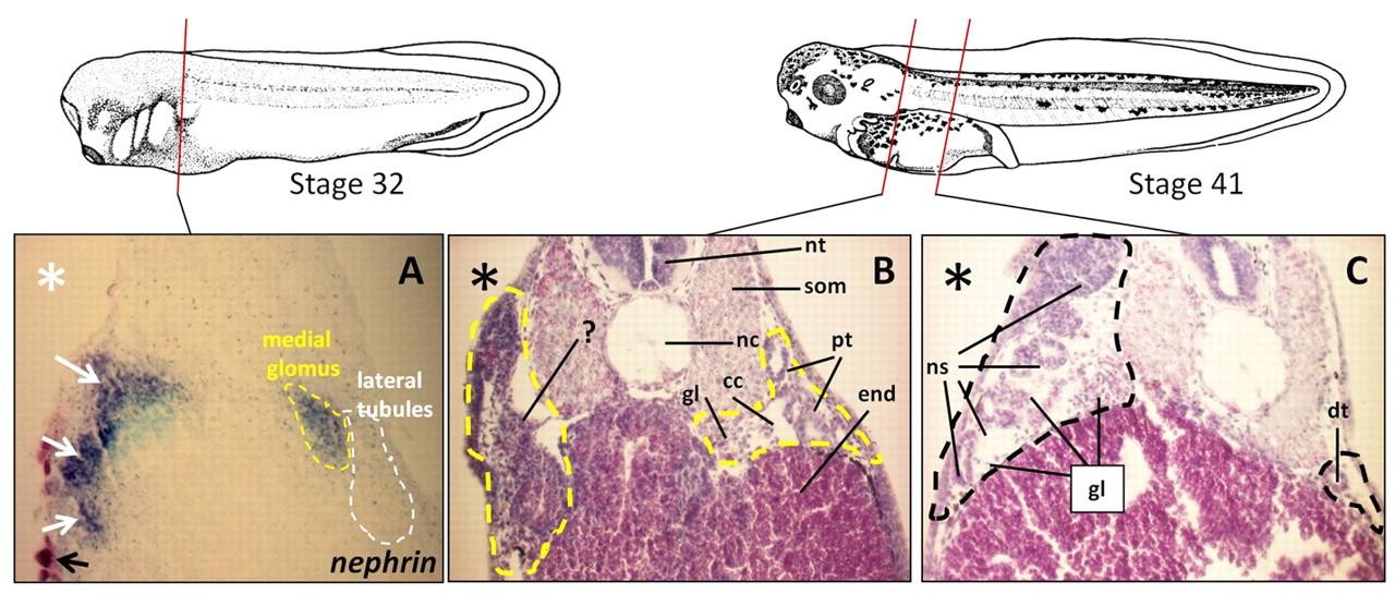 Fig. 6. Early notch-ICD and wnt4 overexpression promotes medial pronephrogenesis at the expense of lateral pronephric cell fates. (A-C) X. laevis embryos injected with notch-ICD mRNA, cultured to stage 32, and in situ hybridised for nephrin expression, were paraplast sectioned (A). notch-ICD overexpression causes the domain of nephrin expression to extend laterally. Paraplast wax sectioning of stage 41 embryos injected with notch-ICD mRNA highlights the severity of this phenotype (B,C). Normal pronephric layout in section can be observed on the uninjected side of B. On the injected side of this embryo, a mass of non-distinct cells can be observed proximally (B), and in the distal region ectopic nephrostomal tubules and podocytes can be detected (C). Regions of interest are outlined (dashed lines). Asterisk denotes injected side. gl, glomus; cc, coelomic cavity; pt, proximal tubules; end, endoderm; nc, notochord; som, somites; nt, neural tube; ns, nephrostomes; dt, distal tubules. |