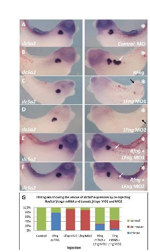 Fig. S8. rfng overexpression can rescue the effect of Lfng depletion in the pronephros. We previously showed rfng translation is not inhibited by either lfng MO1 or lfng MO2 (see Fig. S1E in the supplementary material). Given the previously characterised functional homology between vertebrate Fringe proteins, we co-injected rfng mRNA with lfng MO1 and lfng MO2 and attempted to rescue expression of the proximal tubule marker, slc5a2. X. laevis embryos were injected at the eight-cell stage into a ventro-vegetal blastomere to target the presumptive pronephric region, with beta-galactosidase mRNA to act as a lineage tracer (red staining on injected side). (A-G) Embryos were cultured to stage 34 when whole-mount in situ hybridisation for expression of slc5a2 was detected. Injection of a control MO had no effect on proximal tubulogenesis (A). rfng overexpression, as reported in Fig. 6C, caused ectopic expression of slc5a2 in the distal pronephric region (white arrow, B). Injection of either lfng MO1 (C) or lfng MO2 (D) completely inhibits slc5a2 expression; these embryos have gross developmental defects, highlighted by curling and perturbed growth of the tail region (black arrows). Upon co-injection of rfng mRNA with lfng MO1 (E) or lfng MO2 (F), slc5a2 expression is rescued, and in some cases over-rescue is achieved with ectopic slc5a2 expression being observed (white arrows). Overall, gross developmental defects detected after single injections of lfng MO1 or lfng MO2 were also rescued, the embryos look healthy and morphologically similar to controls. A histogram illustrates rescue of Lfng depletion by rfng overexpression in the pronephros, with much fewer embryos having reduced slc5a2 expression after co-injection of lfng MO1 and lfng MO2 with rfng mRNA than after single injections of lfng MO1 or lfng MO2 (G). We propose that Rfng is able to rescue the effects of Lfng depletion. This conclusion suggests functional homology between Rfng and Lfng exists. Asterisk denotes injected side. In addition, we have also rescued the inhibitory effects lfng MO1 and lfng MO2 had on nephrin expression with rfng mRNA and also the effect lfng MO2 had on slc5a2 and nephrin expression with lfng mRNA. |