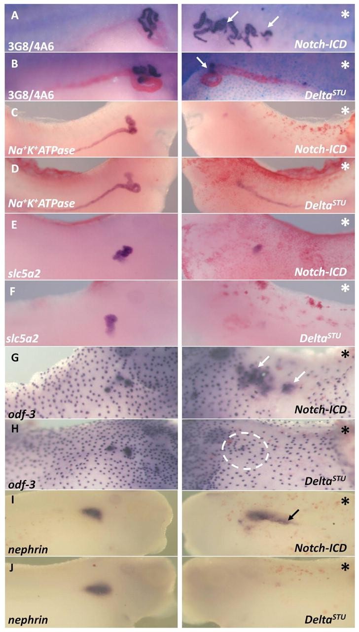 Fig. 1. Mis-activating early pronephric Notch signalling caused ectopic medial pronephrogenesis. (A-J) X. laevis embryos were injected at the eight-cell stage into a V2 blastomere to target tissues including the presumptive pronephric region. notch-ICD mRNA or deltaSTU mRNA was co-injected with beta-galactosidase mRNA to act as a lineage tracer [blue (A,B); red (C-J) staining on the injected side]. At stage 41, 3G8 is ectopic (white arrows) and 4A6 is reduced in embryos injected with notch-ICD mRNA (A). deltaSTU reduces 3G8 staining (white arrow) but has no effect on 4A6 staining (B). At stage 36, Na+K+ATPase expression is reduced after overexpression of notch-ICD (C), but only the proximal domain of Na+K+ATPase expression is reduced upon deltaSTU overexpression (D). slc5a2 expression is inhibited after overexpression of notch-ICD (E) and deltaSTU (F). At stage 32, odf3 (white arrows, G) and nephrin (black arrow, I) expression is ectopic upon notch-ICD mRNA injection. odf3 (white circle, H) and nephrin (J) are inhibited by deltaSTU. Asterisk denotes injected side. |