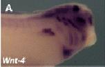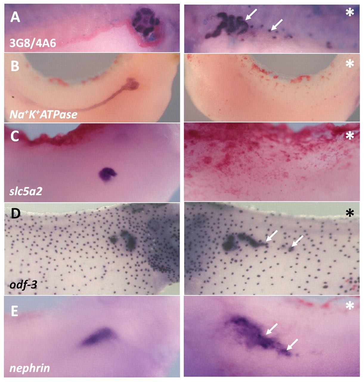 Fig. 2. wnt4 overexpression induces the same phenotypes as injection of notch-ICD mRNA. (A-E) X. laevis embryos were injected as previously described. wnt4 mRNA was co-injected with beta-galactosidase mRNA to act as a lineage tracer [blue (A); red (B-E) staining on the injected side]. At stage 41, 3G8 is ectopic (white arrows) and 4A6 is reduced on the injected side (A). At stage 36, Na+K+ATPase (B) and slc5a2 (C) expression is reduced upon wnt4 overexpression and at stage 32 odf3 (D) and nephrin (E) expression is ectopic (white arrows). Asterisk denotes injected side. |