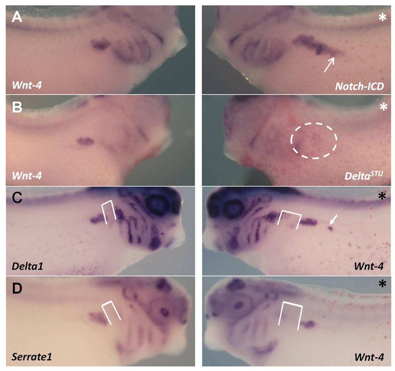 Fig. 3. Notch signalling regulates pronephric wnt4 expression. (A-D) X. laevis embryos were injected as previously described, with mRNA co-injected with beta-galactosidase mRNA to act as a lineage tracer (red staining on the injected side). Embryos were cultured to stage 28 when wnt4 (A,B), delta1 (C) and serrate1 (D) expression was detected by in situ hybridisation. Mis-activation of Notch signalling by injection of notch-ICD mRNA causes ectopic wnt4 expression (white arrow, A), whereas deltaSTU mRNA inhibits wnt4 expression (B). wnt4 overexpression does not have an effect on delta1 or serrate1 expression levels (B). Expression of both these genes is altered in the anteroposterior register; frequently, expression is more distal (white brackets) and rarely ectopic (white arrow, C). Asterisk denotes injected side. |