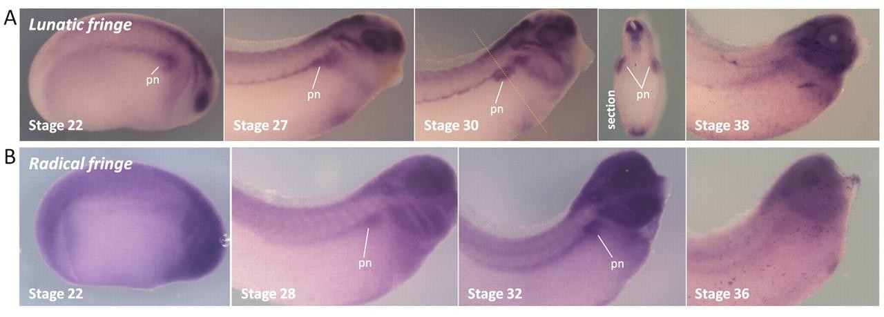 Fig. 7. lfng and rfng are expressed in appropriate temporal and spatial regions for a role in regulation of pronephric Notch signalling. (A,B) Whole-mount in situ hybridisation was carried out with a DIG-labelled anti-sense RNA probe for lfng (A) and rfng (B). lfng expression is detected in the dorso-anterior pronephros anlagen between stages 22 and 32. Transverse section of a stage 30 embryo clearly identifies this pronephric expression. At stage 38, pronephric lfng expression is lost. rfng expression in the pronephros is detected slightly later, at stage 26, and persists to stage 32/33. By stage 36, no pronephric expression of rfng could be detected. pn, pronephros. |