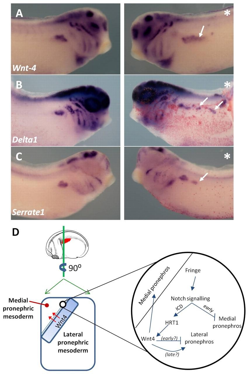 Fig. 9. rfng promotes expression of wnt4 and components of the Notch pathway. (A-C) X. laevis embryos were injected as previously described and cultured to stage 28, with beta-galactosidase mRNA co-injected to act as a lineage tracer (red staining on injected side). Ectopic wnt4 (A), delta1 (B) and serrate1 (C) expression was detected after rfng mRNA injection. Asterisk denotes injected side. (D) A model for early stage proximal pronephrogenesis regulated by the Notch signalling pathway. We propose a pool of cells undergoing Notch signalling and located on the lateral side of the dorso-anterior pronephros anlagen at tail bud stages of development, mediate medio-lateral patterning, permitting the glomus and tubules to develop independently. Blue arrows indicate proposed genetic hierarchy; red arrows indicate directional secretion of Wnt4. See text for full description. |