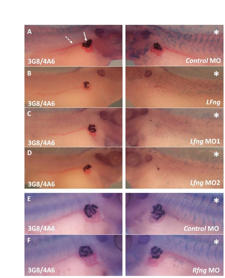 Fig. S5. lfng misexpression inhibits pronephros formation, knockdown of rfng translation has no effect on pronephrogenesis.X. laevis embryos were injected at the eight-cell stage into a ventro-vegetal blastomere to target the presumptive pronephric region, with beta-galactosidase mRNA to act as a lineage tracer (blue staining on injected side). (A-D) Embryos were cultured to stage 41, when they were fixed, stained for the lineage label and correctly targeted embryos were whole-mount antibody stained for epitopes in the nephrostomes and proximal tubules, detected by 3G8 (purple stain, white arrow), and intermediate and distal tubules, detected by 4A6 (red stain, dashed white arrow). Injection of a control MO in addition to beta-galactosidase mRNA had no effect on pronephros development (A and E). Injection of lfng mRNA (B), lfng MO1 (C) and lfng MO2 (D) inhibited pronephrogenesis, as observed by reduced 3G8 and 4A6 staining. Additionally, we have observed the effects of lfng mis-expression on slc5a2, nephrin and Na+K+ATPase expression and found all domains of the pronephros did not form (data not shown). Injection of the rfng MO had no effect on pronephrogenesis, 3G8 and 4A6 staining was normal on the injected side. We also did not detect any effect of Rfng depletion on slc5a2, nephrin and Na+K+ATPase expression, showing all pronephric compartments formed (data not shown). Asterisk denotes injected side. |