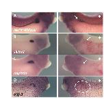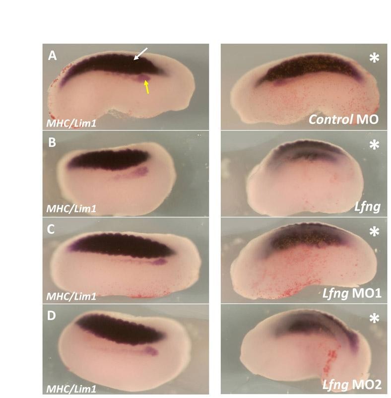 Fig. S7. lfng mis-expression perturbs myogenesis and early pronephros development.X. laevis embryos were injected at the eight-cell stage into a ventro-vegetal blastomere as previously described, with β-gal mRNA to act as a lineage tracer (red staining on injected side). Embryos were cultured to stage 24 when whole-mount double in situ hybridisation for expression of the gene encoding myosin heavy chain (MHC, a terminally differentiated muscle marker, white arrow) and lim1 (a marker of the early pronephros anlagen, yellow arrow) was detected. (A) Injection of a control MO had no effect on either lim1 or MHC expression. (B-D) Injection of lfng mRNA and depletion of lfng translation by injection of either lfng MO1 or lfng MO2 completely inhibited lim1 expression and significantly reduced MHC expression on the injected side. As the myotome is required to signal to the intermediate mesoderm to induce pronephrogenesis (Mauch et al., 2000; Mitchell et al., 2007; Seufert et al., 1999), perturbed myogenesis would be a cause of inhibited pronephrogenesis. Taken together with an early inhibition of Xbrachyury expression, we believe that lfng mis-expression causes gross developmental defects that indirectly prevent pronephrogenesis. Consequently, we are unable to confirm a role for Lfng in pronephros development. Asterisk denotes injected side. It is unsurprising lfng mis-expression affects development more severely than rfng mis-expression as it has been shown to have a much higher catalytic activity (Rampal et al., 2005) and it is likely to be the major Fringe protein during development; Rfng has been suggested to have no role in mouse development (Visan et al., 2006; Zhang et al., 2002). |