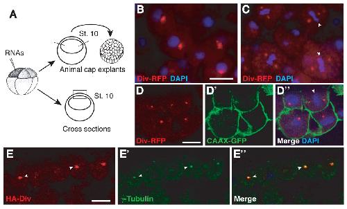 Fig.1. Overexpressed Diversin localizes to the centrosome in Xenopus ectoderm. (A) Experimental scheme. (B-E) Two animal blastomeres of eight-cell embryos were injected with 0.5 ng of Diversin-RFP (Div-RFP; B-D) or HA-Diversin (HA-Div; E) RNA alone or with 0.15 ng of CAAX-GFP RNA. At stage 10, the injected embryos were fixed for immunostaining on cryosections or used to prepare ectodermal explants. (B,C) In ectodermal explants, Div-RFP was distributed as a single dot in interphase cells (B) or two dots in mitotic cells (C). (D,E) In cryosections, Div-RFP was distributed in ectodermal cells at early gastrula stage as one or two dots per cell and colocalized with γ-tubulin (E). (D) CAAX-GFP stained with anti-GFP antibodies marks the cell membrane. RFP and DAPI co-staining is shown (B,C) or a merged image (Dâ²). Metaphase plates (C,Dâ²) or centrosomes (E) are indicated by arrowheads. Scale bars: 20 μm. Scale bar in B also applies to C. |