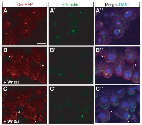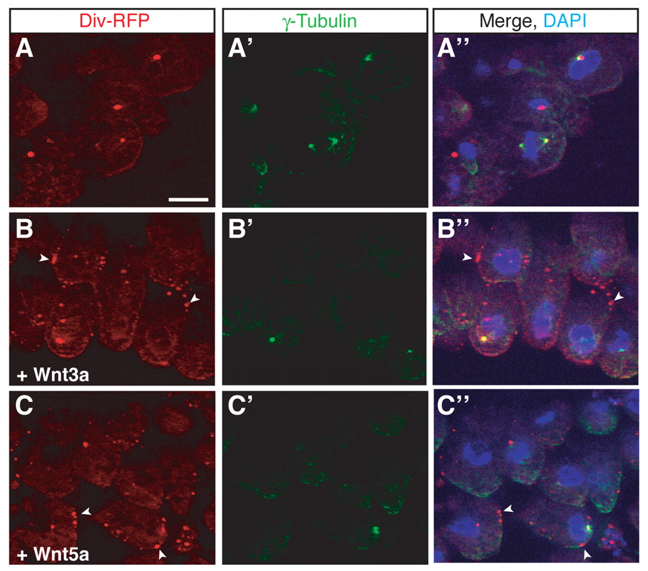 Fig.2. Diversin is translocated into cortical puncta in response to Wnt proteins. Embryos were co-injected with Diversin-RFP RNA (0.5 ng) and either Wnt3a or Wnt5a RNA (1 ng each) as described in Fig. 1A. Cryosections were co-stained with anti-γ-tubulin. Diversin-RFP overlaps, but does not completely colocalize with γ-tubulin, a centrosome marker (A-Aâ²). Upon coexpression with Wnt3a (B) or Wnt5a (C), Diversin fluorescence is redistributed to cytoplasmic and cortical puncta (arrowheads in B,Bâ²,C,Câ²), whereas γ-tubulin staining is not affected. DAPI co-staining is shown in merged images on the right. Scale bar: 20 μm. |
