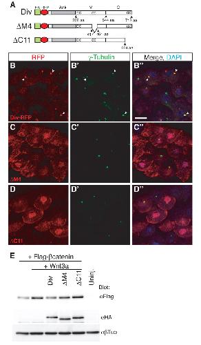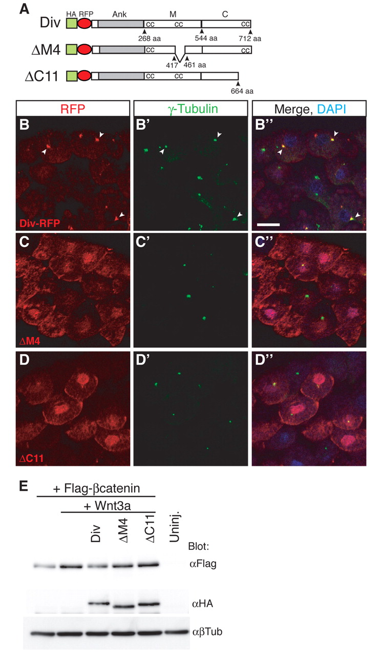 Fig.6. Diversin constructs with a defect in centrosomal localization are unable to promote β-catenin degradation. (A) HA-Diversin-RFP constructs with deletions in the middle and in the C-terminal region. (B-D) Cryosections prepared from embryos injected with the following RNA: HA-Diversin-RFP (0.3 ng), HA-δM4 (0.15 ng) or HA-δC11 (2 ng). Sections were immunostained with anti-γ-tubulin antibodies. δM4 and δC11 reveal mostly nuclear and peri-membrane, rather than centrosomal, localization. (B-D) Diversin colocalized with γ-tubulin (arrowheads). Scale bar: 20 μm. (E) Levels of β-catenin in embryonic animal caps injected with the following RNAs: FLAGâβ-catenin (30 pg), Wnt3a (10 pg), HA-Diversin-RFP (0.5 ng), HA-δM4 (0.25 ng) and HA-δC11 (2 ng). Wnt3a-dependent β-catenin stabilization was inhibited by wild-type Diversin, but not by δM4 or δC11. Diversin constructs are expressed at similar levels, β-tubulin is a loading control. Uninj., un-injected. |