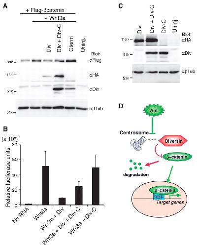 Fig.8. Div-C diminishes Wnt inhibitory activity of the wild-type Diversin. (A) Div-C suppresses the inhibitory effect of wild-type Diversin on β-catenin stabilization. RNAs injected were: Wnt3a (10 pg), HA-Diversin-RFP (0.5 ng), Div-CâRFP (1 ng) and FLAGâβ-catenin (30 pg). (A,C) After protein separation and transfer, transfer membranes were cut at approximately the 80-kD band level and separately probed with anti-HA antibody to detect overexpressed wild-type Diversin and with anti-Diversin antibody to detect Div-C (which has no HA tag). β-tubulin is a loading control. (B) Div-C diminishes the inhibitory effects of Diversin on Siamois reporter activation by Wnt3a. Luciferase assay with pSia-Luc DNA (20 pg) upon co-injection of 10 pg of Wnt3a RNA with 0.5 ng of HA-Div-RFP and 1 ng of Div-C-RFP into animal ventral blastomere of eight-cell embryos. Four groups of six embryos were collected at stage 10 for the reporter assay. Means ± s.d. are shown. (C) Diversin and Div-C expression levels in embryos used for B. (D) Model for Diversin function at the centrosome. Centrosomal Diversin promotes β-catenin degradation. Upon Wnt signaling, Diversin is redistributed to punctate structures at the cell cortex and the cytoplasm, resulting in stabilized β-catenin and increased target gene transcription. |