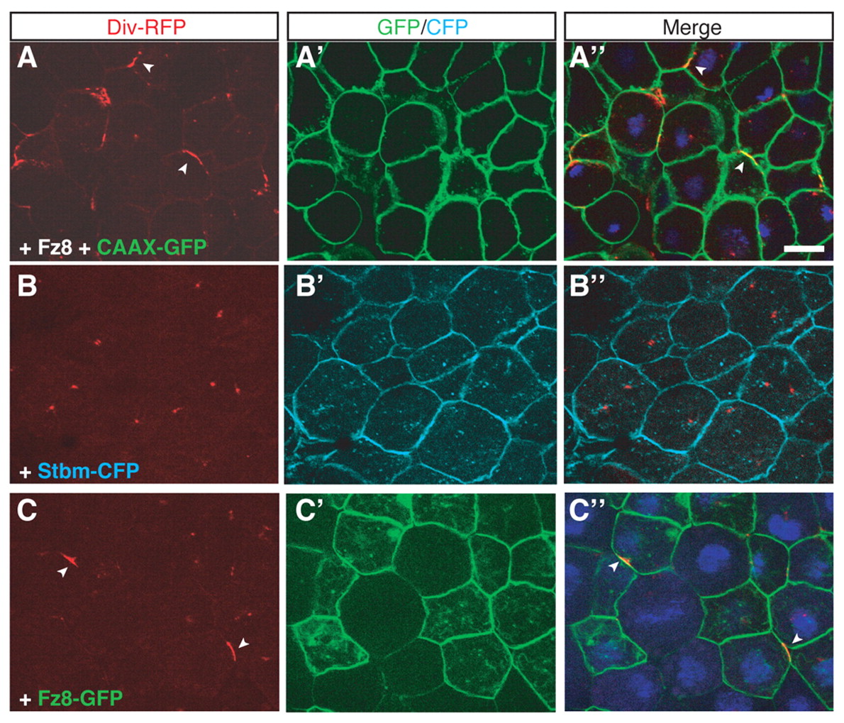 Fig.3. Non-uniform membrane recruitment of Diversin by Fz. (A-C) Animal cap explants were prepared from stage-10 embryos injected as described in Fig. 1A with the following RNAs: Div-RFP (0.5 ng), Fz8 (1 ng), Stbm-CFP (0.5 ng), CAAX-GFP (0.1 ng) and Fz8-GFP (1 ng). Diversin was recruited to the cell membrane in a non-uniform manner by Fz8 (A,C; arrowheads), but not by Stbm (B). The distribution of Fz8-GFP differed from the localization of Diversin (C). Note the uniform membrane localization of CAAX-GFP, Stbm-CFP and Fz8-GFP (A-C). Scale bar: 20 μm. |