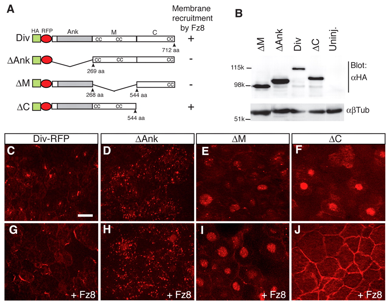Fig.5. Different Diversin domains play distinct roles in Diversin subcellular localization. (A) Diversin constructs and summary of the Fz8 recruitment data. Ank, ankyrin repeats (grey bar); M, middle region; C, C-terminal region; cc, coiled-coil motif. (B) Western analysis of stage-10.5 embryo lysates demonstrates similar expression levels of Diversin constructs. Embryos were injected with the following RNAs: HA-Div-RFP (0.5 ng), HA-δM-RFP (0.25 ng), HA-δAnk-RFP (0.25 ng) and HA-δC-RFP (2 ng). β-tubulin (βTub) controls loading. Molecular weight markers are indicated. Uninj., un-injected. (C-J) Animal cap explants from embryos injected with Diversin RNAs as in B (C-F) or co-injected with Fz8 RNA (1 ng; G-J). In the absence of Fz8, δAnk is present in many puncta (D), δM in nucleoplasm and nuclear puncta (E), and δC in the nucleus (F). Upon coexpression of Fz8, δC and full-length Diversin were recruited to the cell cortex (G,J), whereas δAnk and δM were not (H,I). Note the uniform membrane localization of δC (J). Scale bar: 20 μm. |
