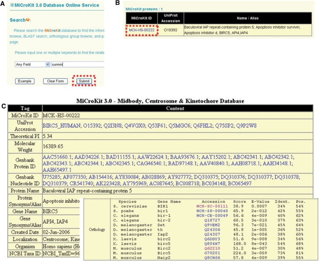 Figure 1. The search option of MiCroKit 3.0 database. (A) Users could simply input ‘survivin’ for querying. (B) The results will be shown in a tabular format. Users could click on the MiCroKit ID (MCK-HS-00222) to visualize the detailed information. (C) The detailed information of human Survivin. The orthologous information was pre-calculated and manually checked.