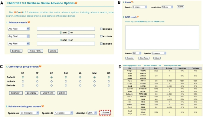 Figure 2. Five advance options in MiCroKit 3.0. (A) Advance search allows users to input up to three terms for querying; (B) browse and BLAST search; (C) orthologous group browse and Pairwise orthologous browse; (D) the default example of pairwise orthologous browse. The orthologous information (identity ≥ 20%) between M. musculus and H. sapiens will be shown in details. The proteins collected in the MiCroKit database are marked in bold.