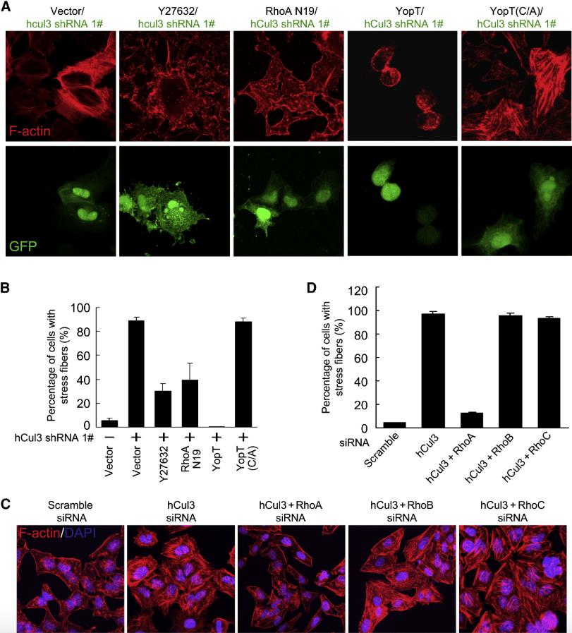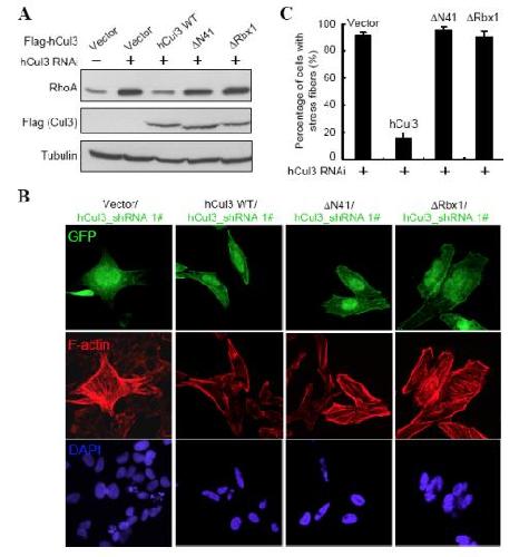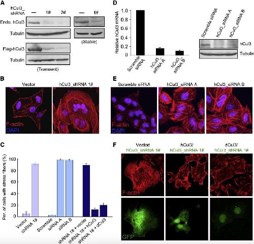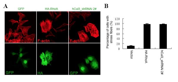 Figure S1. Effects of Additional hCul3-Targeting shRNAs on Stress Fiber Formation and RhoA Accumulation. (A) Immunoblotting analysis of HeLa cells transfected with hCul3_shRNA 2#, 3#, or 4# using indicated antibodies. (B) Staining of HeLa cells transfected with indicated hCul3 shRNA plasmid. F-actin stained with Rhodamine-Phalloidin is in red and GFP marks the RNAi cell. (C) Statistics of HeLa cells showing actin stress fibers in (B). All the data represent mean ± SD (error bar) of three independent determinations. At least 200 GFP-positive cells were counted for each experiment |