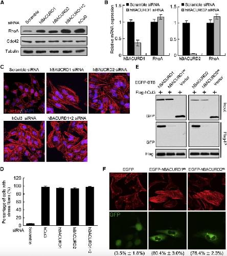 Figure 4. The BACURD Family BTB Proteins Are Involved in RhoA Accumulation and Stress Fiber Formation Induced by Cul3 Knockdown (A) Immunoblotting assays of effects of hBACURD1 and hBACURD2 knockdown on protein levels of endogenous Rho GTPases. HeLa cells were transfected with hBACURD1 siRNA 1#, hBACURD2 siRNA 1#, or scramble siRNA, and total cell lysates were immunoblotted using indicated antibodies. (B) qRT-PCR measurements of mRNA expression of hBACURDs and RhoA in HeLa cells treated with scramble siRNA, hBACURD1 siRNA 1#, or hBACURD2 siRNA 1#. Experiments were performed and data are presented similarly to those in Figure 3C. Error bar indicates SD. (C and D) Actin stress fibers in hBACURD knockdown HeLa cells. hCul3_siRNA A, hBACURD1 siRNA 1#, and hBACURD2 siRNA 1 were used here. Shown in (C) are representative cell images where DAPI staining marks the nucleus and F-actin denotes the filamentous actin stained by rhodamine-phalloidin. Statistics of cells showing strong actin stress fibers are shown in (D) and presented as mean ± SD (error bar) of at least two independent determinations. Two hundred and fifty cells were counted for each experiment. (E) Coimmunoprecipitation assays of binding between Cul3 and hBACURDs. Flag-hCul3 and indicated EGFP-tagged hBACURD1 or hBACURD2 constructs were cotransfected into 293T cells. The total cell lysates (Input) and Flag immunoprecipitates (Flag-IP) were blotted using indicated antibodies. hBACURD1m and hBACURD2m denote the hBACURD1 V84A/L85A/I86A and hBACURD2 I71A/L72A/I73A triple mutant, respectively. (F) Actin stress fibers induced by dominant-negative mutants of hBACURDs. HeLa cells were transfected with indicated EGFP-tagged Cul3-binding-deficient hBACURD mutants identified in (E). Upper panels, rhodamine-phalloidin staining of the filamentous actin; lower panels, transfected cells marked by GFP staining; numbers in the parenthesis, statistics of GFP-positive cells showing actin stress fibers. |