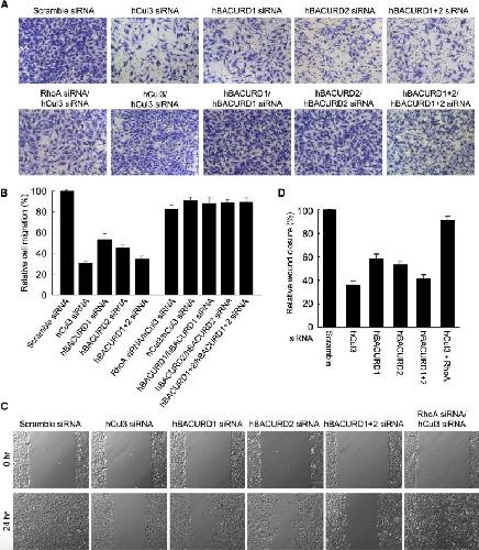Figure 6. The Cul3/BACURD Complex Is Essential for Migration of Cultured Cells (A and B) Boyden chamber cell-migration assays. HeLa cells were treated with hCul3_siRNA A or hBACURD siRNAs (1#, see Table S2). Co-knockdown of hRhoA or expression of the RNAi-resistant hCul3 or hBACURDs was carried out to test their rescue effects. Assays were performed as described under Experimental Procedures. Migrated cells on the lower side of the filter were stained with crystal violet and shown in (A). Relative cell migration shown in (B) was determined by counting nine random fields of the filter, and the value from the control RNAi cells was arbitrarily set at 100%. Error bar indicates SD. (C and D) Wound-healing assays of hCul3 or hBACURD knockdown HeLa cells. The siRNA oligos used are the same as those in (A). Confluent HeLa cells treated with indicated siRNAs were scratched by a plastic pipette. Cells were photographed at 0 or 24 hr after wounding (C). The width of the wound was measured to determine the relative wound closure (D), with that of the control siRNA-treated cells arbitrarily set as 100%. Error bar indicates SD. |