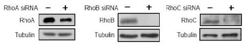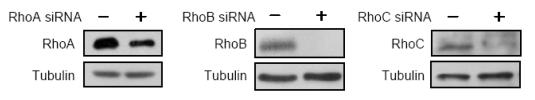 Figure S3. Validation of RhoA, RhoB, and RhoC-Targeting siRNAs Shown are immunoblotting of HeLa cells treated with RhoA siRNA (left panels), RhoB siRNA (middle panels), or RhoC siRNA (right panels) using indicated antibodies. GFP siRNA (-) was used as the control. |