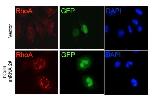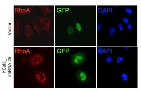 Figure S5. Immunostaining of RhoA in Cul3 Knockdown Cells HeLa cells were transfected with GFP-labeled empty shRNA vector or hCul3_shRNA 2# plasmid. Cells were stained with the RhoA specific antibody (red). GFP (green) marks the transfected cells and DAPI (blue) denotes the nuclei. |