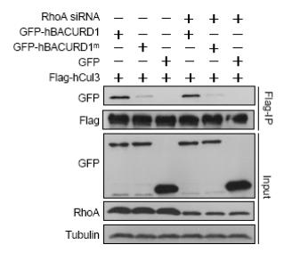 Figure S11. Coimmunoprecipitation Assays of Binding between Cul3 and hBACURDs in RhoA RNAi Cells Flag-hCul3 and indicated EGFP-tagged hBACURD1 or hBACURD2 constructs were cotransfected into 293T cells or 293T cells treated RhoA siRNA. The total cell lysates (Input) and Flag immunoprecipitates (Flag-IP) were blotted using indicated antibodies. hBACURD1m and hBACURD2m denote the hBACURD1 V84A/L85A/I86A and hBACURD2 I71A/L72A/I73A triple mutant, respectively. |