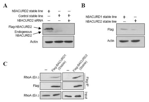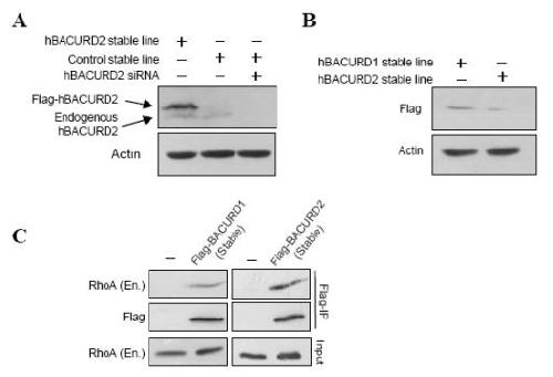 Figure S12. Coimmunoprecipitations between Endogenous RhoA and Flag-hBACURDs in hBACURD Stable Cell Lines (A) Western blot analysis of hBACURD2 expression in the indicated HeLa cell extracts using the hBACRUD2 specific antibody. Identity of endogenous hBACURD2 band was verified by hBACURD2 siRNA (1#) knockdown as shown. (B) Western blot comparison of expression levels of Flag-BACURDs in corresponding hBACURD1 or hBACRUD2 stable HeLa cell lines. (C) Endogenous RhoA forms complexes with Flag-hBACURDs. Lysates of Flag-BACURDs stable cell lines were subjected to Flag immunoprecipitation. The bound proteins were eluted and analyzed by immunoblotting using RhoA (upper panels) or Flag antibodies (middle panels). The lower panel shows inputs of RhoA. RhoA (En.) denotes the endogenous RhoA protein. |