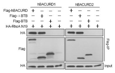 Figure S13. Interactions between RhoA and hBACURD Deletion Mutants Full-length Flag-hBACURDs, or Flag-ÎBTB (amino acids 184-329 for hBACURD1 and 171-310 for hBACURD2), or Flag-BTB (amino acids 1-168 for hBACURD1 and 1-155 for hBACURD2) were co-transfected together with HA-RhoA N19 into 293T cells and cell lysates were subjected to Flag immunoprecipitations. The upper two panels are anti-Flag and anti-HA blots of the immunoprecipitates and the low panel shows anti-HA blots of the total RhoA N19. |