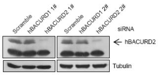 Figure S14. Validation of the hBACURD2 Antibody and Specific Knockdown of hBACURD2 by hBACURD2 siRNAs HeLa cells were treated with scramble siRNA or each of the two independent hBACURD1 or hBACURD2 siRNAs (see Table S2). Total cell lysates were immunoblotted with the hBACURD2 antibody (upper panels). Tubulin blots shown in the lower panels are loading controls. |