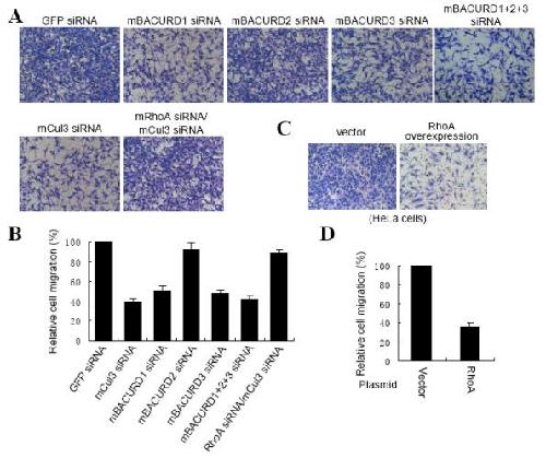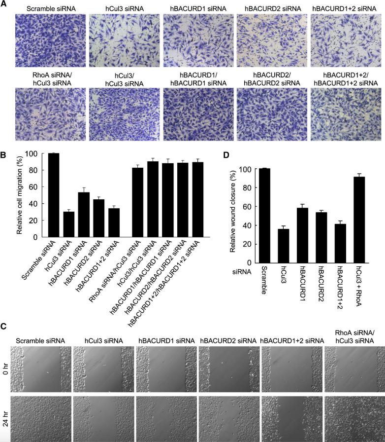 Figure S17. Boyden Chamber Assays of Migration Potential of Cul3 and BACURD Knockdown MEF Cells and RhoA âoverexpressing HeLa Cells (A and B) MEF cells treated with indicated siRNAs or siRNA combinations. (C and D) HeLa cells transfected with an empty vector or a RhoA-expressing plasmid. The assay was performed and data are presented similarly as those in Figure 6A (for A and C) and in Figure 6B (for B and D). Error bar indicates SD. |