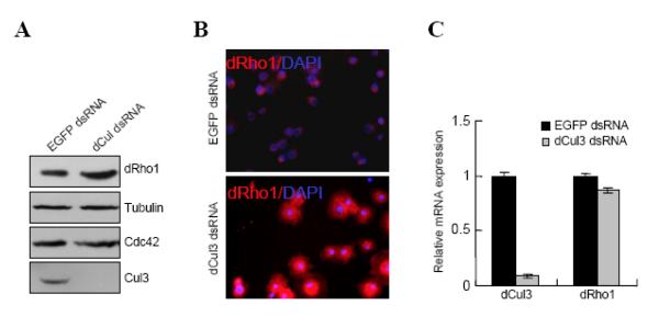 Figure S7. Effects of Cul3 Knockdown on Rho GTPases in Drosophila S2 Cells (A) Immunoblotting assays of Drosophila S2 cells treated with either EGFP dsRNA or dCul3 dsRNA using indicated antibodies. The human Cdc42 and Cul3 antibodies were used to detect Drosophila Cdc42 and Cul3 after verification through specific dsRNA knockdown. (B) Effects of dsRNA knockdown of dCul3 on dRho1 by immunofluorescence assays. Shown are overlay fluorescence images of S2 cells stained with DAPI and anti-dRho1 antibody. (C) qRT-PCR measurements of the mRNA level of dCul3 and dRho1 in S2 cells treated with EGFP dsRNA or dCul3 dsRNA. Error bar indicates SD. |
