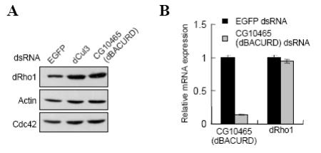 Figure S8. Identification of Drosophila BACURD Whose Knockdown Leads to Accumulation of dRho1 in S2 Cells (A) Immunoblotting of total cell lysates from S2 treated with dsRNAs for EGFP, dCul3, or CG10465 (dBACURD). Antibodies used are listed on the left of the blot. (B) qRT-PCR measurements of mRNA of dBACURD and dRho1 in S2 cells treated with EGFP or dBACURD dsRNA. Error bar indicates SD. |