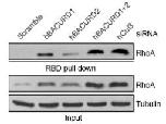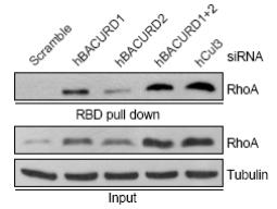 Figure S10. RBD Pulldown Assays of RhoA-GTP in hBACURD Knockdown Cells HeLa cells transfected with scramble siRNA or hBACURD siRNA 1# were lysed and GTP-bound RhoA was precipitated by GST-RBD and analyzed by RhoA immunoblotting (RBD pulldown, upper panel). Immunoblots of indicated total protein levels are shown in the lower panels (input). |