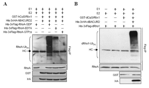 Figure S15. In Vitro Ubiquitination of RhoA by the Cul3/hBACURD Complex (A) The same assay as that described in Figure 4F except that hBACURD2 rather than hBACURD1 protein was used. (B) In vitro ubiquitination of dRho1 by the dCul3/Rbx1/dBACURD complex. Experiments were carried out similarly as described in Figure 4E except for the different proteins added into the reaction. Denotations are also similar as those in Figure 4E. |