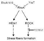 Figure S2. Diagram of the RhoA Pathway Controlling Actin Stress Fiber Assembly RhoA N19 is a dominant-negative mutant, and YopT is a cytotoxin that proteolyzes and inactivates RhoA. Y27632 is a potent ROCK inhibitor. |