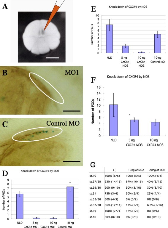 Fig. 2. CXCR4-knockdown experiments. (A) A schematic diagram of the microinjection procedure. Embryos at the 32-cell stage were rotated upside down using a hair loop in a well at the bottom of a hybridoma dish filled with 1.5% methylcellulose solution. NLD mRNA, mixed with or without morpholino oligos (MOs) including MO1, MO2, MO3 or a control MO, was injected into one of the vegetal blastomeres containing germ plasm. Embryos were fixed at stage 46 and stained. Bar = 500 μm. (B and C) Whole mount x-gal staining of the stage 46 tadpoles injected with NLD mRNA mixed with 10 ng of MO1 (B), 10 ng of control MO (C). The white ellipse indicates the position of PGCs in the genital ridge. Bar = 200 μm. (DâF) Effect of injected MOs on the numbers of successfully migrating PGCs. In each bar chart, the vertical axis shows the mean number of PGCs per embryo and the horizontal axis shows the quantity of MOs used: MO1 (D), MO2 (E) and MO3 (F). The bar indicates the standard error of the mean. Data are listed in Table 1. (G) NLD mRNA mixed with 10 or 20 ng of MO2 was injected into one of the blastomeres of 32-cell stage embryos and embryos were fixed at indicated stages. The percentages of injected embryos that were positive for PGC staining are shown.