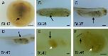 Fig. 1. Visualizing PGCs. NLD mRNA (mRNA coding for LacZ with its 3â²-UTR fused with that of DEADSouth) was injected into single vegetal blastomeres of 32-cell stage embryos and fixed at stages (St.) 12 (A), 28 (B), 37 (C), 40 (D) and 46 (E), followed by x-gal staining. Bleached and cleared embryos were observed using a stereomicroscope. PGCs were identified by their blue nuclei (black arrows). (F) A higher magnification of (E). At stage 46, almost all the PGCs had reached the genital ridge. However, as shown by the white arrows, a few remained in the endoderm and were designated âectopic PGCsâ. Bar = 200 μm.
