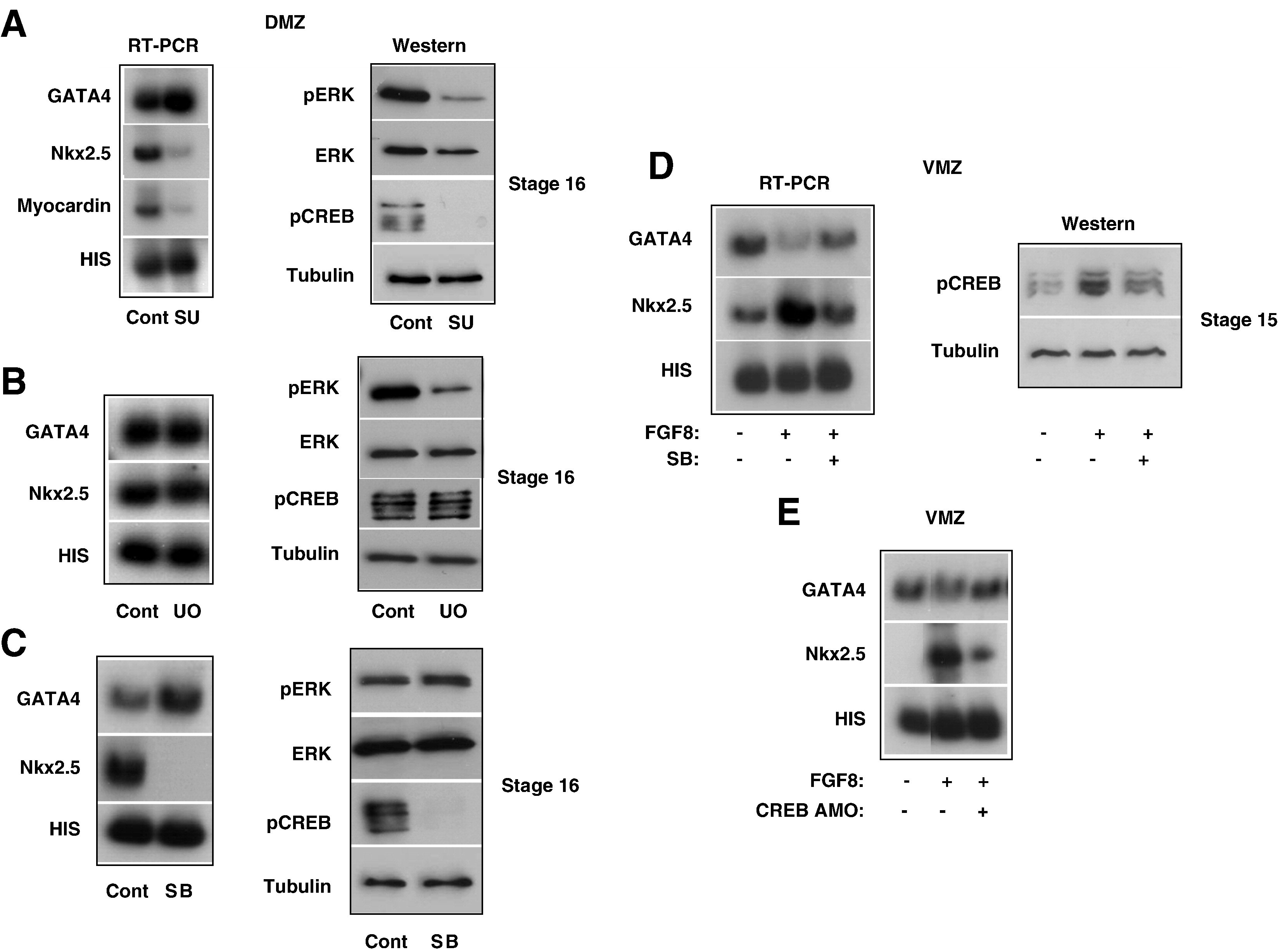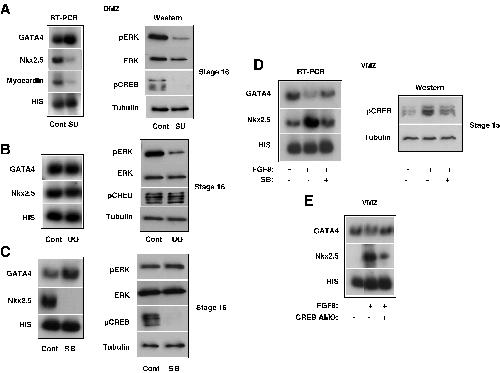 Fig.6. Induction of Nkx2.5 by FGF is mediated by p38MAPK and not by ERKMAPK. (A) DMZ explants (n = 36) were dissected and at stage 11 were cultured in SU 5402 (30 μM) and allowed to develop to stage 16. Half of the explants were used to extract RNA for RT-PCR analysis (left) and the rest were used to extract proteins for Western analysis (right). (B) DMZ explants were cultured and processed as above, except their incubation in U0126 (30 μM). (C) DMZ explants were cultured and processed as above, except their incubation in SB203580 (30 μM). (D) Transcripts encoding FGF8 were injected and VMZ explants (n = 36) were dissected and gown from stages 11 to 15 in the absence or presence of SB203580 (30 μM). Half of the explants were used to extract RNA for RT-PCR analysis (left) and the rest were used to extract proteins for Western analysis (right). (E) Different combinations of transcripts encoding FGF8 and CREB AMO were injected to embryos, and VMZ explants were dissected at stage 10+. RNA was extracted at stage 15 and RT-PCR analysis was performed.