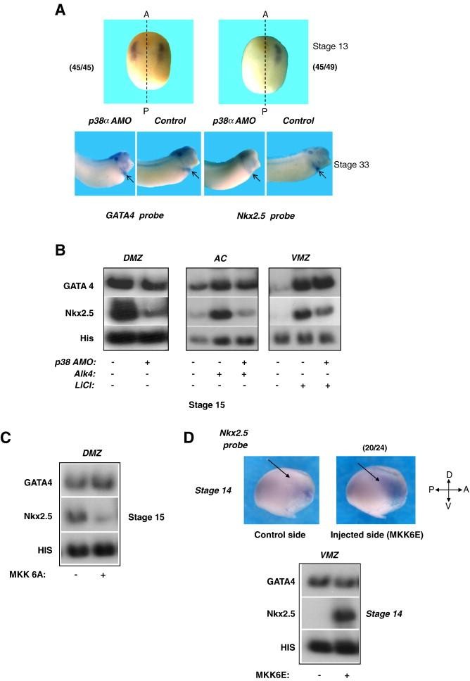 Fig. 2. The p38MAPK pathway is involved in the early expression of Nkx2.5. (A) One of two blastomeres (upper panel) or two of two blastomeres (lower panel) were injected with p38α AMO, and the expression of Nkx2.5 and GATA4 was detected by in situ hybridization of stage 13 (top) and stage 33 (bottom) embryos. (B) p38α AMO was injected to embryos, and gene expression was assessed in three cardiac explant assays; DMZ explants (left), AC explants from Alk4-expressing embryos (middle) and VMZ explants from LiCl-treated embryos (right). At stage 15, total RNA was isolated and RT-PCR analysis was performed. (C) Transcripts encoding inactive MKK6 (MKK6A) were injected to one cell embryos, and DMZ explants (n = 18) were isolated and were grown to stage 15. Total RNA was isolated and RT-PCR analysis was performed. (D) Upper panel: Transcripts encoding MKK6E were injected to one of two blastomere embryos (n = 24). Embryos were allowed to develop to stage 14 and in situ hybridization was performed with a probe to Nkx2.5. The injected side was recognized by the staining of a β-Gal lineage tracer. Lower panel: Transcripts encoding MKK6E were injected to one cell embryos, VMZ explants (n = 18) were isolated and were grown to stage 14. Total RNA was isolated and RT-PCR analysis was performed.