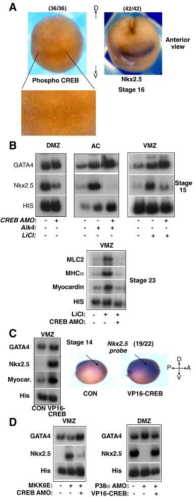 Fig. 3. The CREB protein is involved in the expression of Nkx2.5 downstream of p38MAPK. (A) Stage 16 embryos were immunostained using an antibody to phospho-CREB (S133) (left) or analyzed by in situ hybridization with a probe to Nkx2.5 (right). (B) CREB AMO was injected to embryos, and gene expression was assessed in three cardiac explant assays; DMZ explants (left), AC explants from Alk4-expressing embryos (middle) and VMZ explants from LiCl-treated embryos (right). At stage 15 or stage 23, total RNA was isolated and RT-PCR analysis was performed. (C) Transcripts encoding VP16-CREB were injected to one of two blastomeres (right panel) or to two of two blastomeres (left panel). The expression of Nkx2.5 was detected by in situ hybridization (right panel) or by RT-PCR analysis on VMZ explants (n = 18) (left panel). (D) Different combinations of transcripts encoding activated MKK6 and CREB AMO were injected to embryos and VMZ explants were isolated and grown to stage 14 (left panel). Different combinations of transcripts encoding VP16-CREB and p38α AMO were injected to embryos and DMZ explants were isolated and grown to stage 14 (right panel). Total RNA was isolated and RT-PCR analysis was performed.