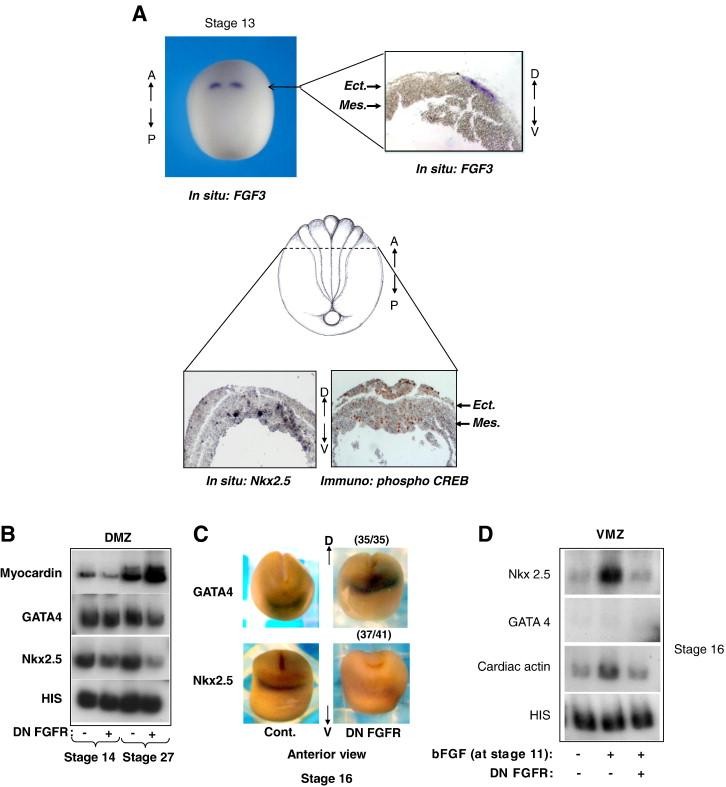 Fig. 4. FGF induces Nkx2.5 gene expression without affecting GATA4 gene expression. (A) Expression of FGF3 was detected on stage 13 embryos by whole-mount in situ hybridization (n = 20) (left). Stained embryos were transversely sectioned at the stained plane. One section is presented (right). Anterior transverse sections in stage 13 embryos followed by in situ staining with a probe to Nkx2.5. Nkx2.5 is expressed in lateralmesoderm of anterior section (bottom left). Adjacent sections immunostained with antibodies to phospho-CREB (S133). Red dots represent nuclear phospho-CREB staining. The embryo scheme indicates the plane section. (B) Transcripts encoding truncated FGF receptor (DN FGFR) were injected to embryos and DMZ explants (n = 36) were isolated and grown to stages 14 and 27. Total RNA was extracted and RT-PCR analysis was performed. (C) Transcripts encoding DN FGFR were injected to one cell embryos and the expression of GATA4 and Nkx2.5 was analyzed by in situ hybridization of stage 16 embryos. (D) VMZ explants were dissected from embryos injected with transcripts encoding DN FGFR or from control embryos. At stage 11, basic FGF (150 ng/ml) was added and explants were grown to stage 16. Total RNA was extracted and RT-PCR analysis was performed.