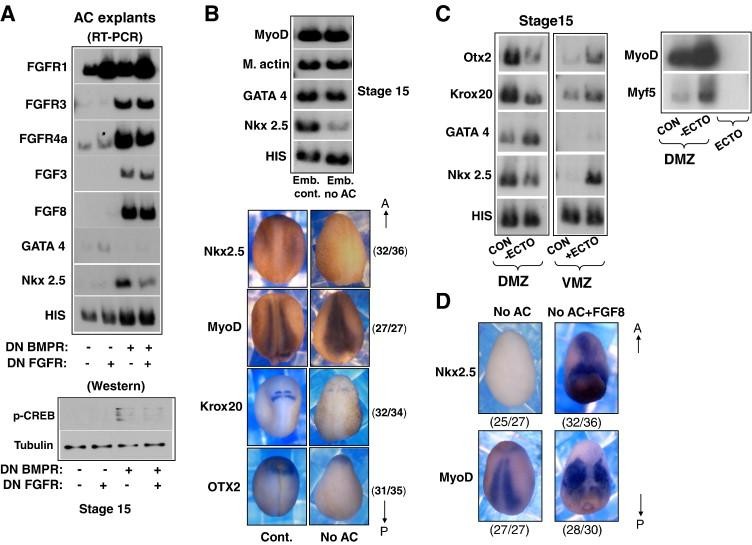 Fig. 5. Anterior neural ectoderm is necessary to induce mesodermal Nkx2.5 expression. (A) Transcripts encoding truncated BMP receptor were injected and AC explants (n = 36) were isolated and grown to stage 15. Half of the explants were used to extract RNA for RT-PCR analysis (upper) and the other half to extract proteins for Western analysis (lower). (B) Animal caps were removed at stages 8â9 from whole embryos. âMildly affectedâ embryos were allowed to grow to stage 15, and whole embryos were extracted and subjected to RT-PCR analysis of their RNA (upper) or to in situ hybridization with probes to Nkx2.5, MyoD, OTX2 and Krox20 (lower). (C) DMZ and VMZ explants were dissected at stage 10.25. Ectoderm was removed from some of the DMZ explants and was recombined with VMZ explants (pairs of VMZ: dorsal ectoderm) or grown alone (ecto.). At stage 15, total RNA was extracted and RT-PCR analysis was performed. (D) Several embryos were injected with mRNA encoding FGF8, and animal caps were removed at stages 8â9. Embryos were allowed to grow to stage 15 and in situ hybridization with probes to Nkx2.5 and MyoD was performed.