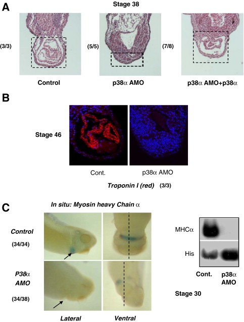 Fig. 1. Knockdown of p38α prevents heart development. (A) Anterior transverse sections of stage 38 control embryos with ventralheart structures, embryos injected with p38α AMO missing heart structures and embryos injected with p38α AMO and a transcript encoding mouse p38α with some heart structures. Sections were hematoxylinâeosin stained. (B) Anterior transverse sections of stage 46 control embryos or of embryos injected with p38α AMO. Sections were immunostained with antibodies to Troponin I (red) and counterstained with TO-PRO-3 (nuclear, blue). (C) Left panel: In situ hybridization staining of stage 30 embryos with a probe detecting myosin heavy chain α. At the two-cell stage, one blastomer was injected with p38α AMO (n = 38). Control group (n = 34) was not injected. Right panel: Embryos were injected with p38α AMO, DMZ explants (n = 18) were isolated and grown to stage 30. Total RNA was isolated and RT-PCR analysis was performed.