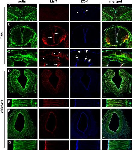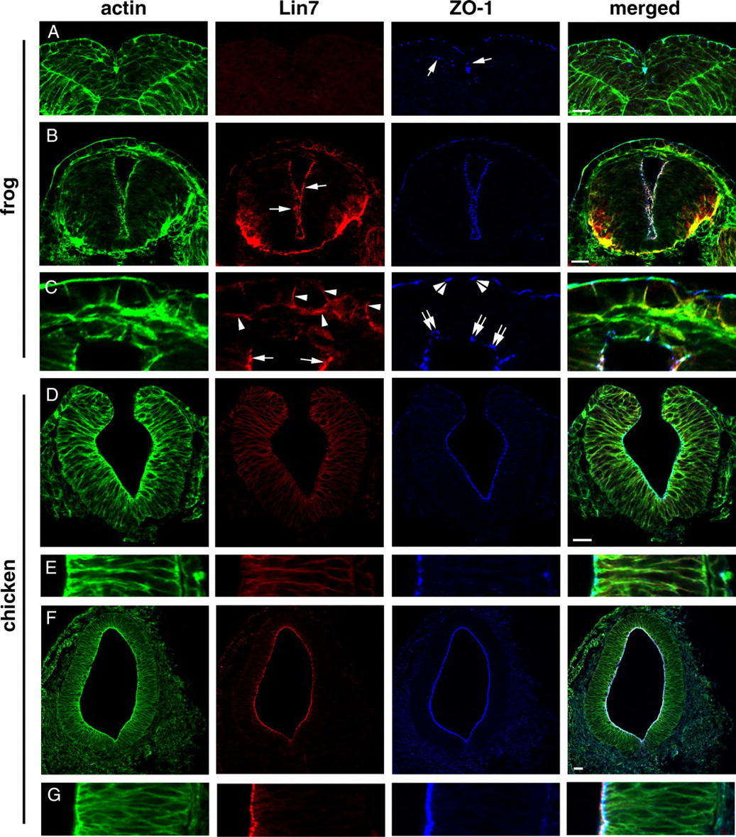 Apical expression of Lin7 lags behind that of ZO-1 in Xenopus laevis ( AâC ) and chicken ( DâG ) neurulation. Actin staining (green) reveals cellular and tissue morphologies. A , During medial intercalation of the neuroepithelial cells at stage 20, Lin7 (red) expression is not detectable in the frog neural fold. ZO-1 (blue; arrows) localizes to the apical side of the neural epithelial cells. B , At stage 30, Lin7 (red, arrows) localizes to the apical surface of the neural tube in frogs. C , Enlarged images of the dorsal region of the neural tube shown in B reveals that Lin7 expression lags behind that of ZO-1 in the roof plate (double arrows). Apical Lin7 expression (arrows) at the lateral walls of the neural tube is strong. Arrowheads indicate Lin7 expression at the basolateral membrane regions in the skin cells. Double arrowheads indicate the apical localization of ZO-1 at tight junctions in the skinepithelium. D , E , At the neural fold stage in chickens, weak Lin7 signal (red) is present at the basolateral membrane regions of the neuroepithelial cells. E shows a magnified local region of the epithelial wall in D . The apical surface is to the left. F , G , At the neural tube stage, a strong Lin7 signal is present at the entire apical surface of the chicken neural tube, apical to the ZO-1 staining. G shows an enlarged local region of the epithelial wall in F . Scale bars, 30 μm.