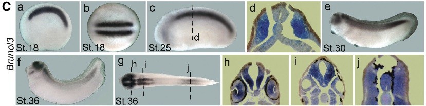 The BRUNOL/CELF family of RNA-binding proteins plays important roles in post-transcriptional regulation and has been implicated in several developmental processes. In this study, we describe the cloning and expression patterns of five Brunol genes in Xenopus laevis. Among them, only Brunol2 is maternally expressed and the zygotic expression of the other four Brunol genes starts at different developmental stages. During Xenopus development, Brunol1, 4-5 are exclusively expressed in the nervous system including domains in the brain, spinal cord, optic and otic vesicles. Brunol2 and 3 are expressed in both the somatic mesoderm and the nervous system. Brunol2 is also extensively expressed in the lens. In transfected Hela cells, BRUNOL1, 2 and 3 proteins are localized in both the cytoplasm and the nucleus, while BRUNOL4 and 5 are only present in the cytoplasm, indicating their different functions.