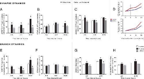 Figure 5. Perturbations in netrin signaling alter presynaptic site and axon branch dynamics. A–D, Netrin and anti-DCC influence presynaptic site dynamics. A, The number of GFP-synaptobrevin-labeled presynaptic sites added was significantly higher in RGCs axons in tadpoles treated with netrin-1 at all observation intervals (y-axis; absolute values). The number of newly added GFP-synaptobrevin-labeled presynaptic sites, however, was decreased after anti-DCC treatment, an effect that became significant in the 8–24 h observation interval. B, A small and gradual increase in the number of stabilized presynaptic clusters was observed after netrin treatment, with the number of stabilized presynaptic sites becoming significantly higher than controls in the 8–24 h interval. C, When expressed as percentage of initial value, the number of presynaptic clusters added after netrin treatment was significantly different from controls at the 0–4 h observation interval only. This suggests that the rate of presynaptic cluster addition was rapidly increased after netrin treatment, to then be maintained at a rate that matched controls. In contrast, when compared with its initial value (percentage of total), the number of presynaptic clusters added was significantly lower in RGC axons in anti-DCC-treated tadpoles both at 4–8 and 8–24 h when compared with controls. Anti-DCC had no effect, however, on the number of GFP-synaptobrevin clusters stabilized (B). D, The rates of increase in total presynaptic site (top), and branch number (bottom), in RGC axons treated with netrin (red) relative to controls (green) are also illustrated by the line graphs. E–H, Netrin and DCC influence branch addition but not stabilization. E, Netrin-1 increased the number of branches added throughout the imaging period, an effect that was significant from 8 to 24 h. The number of branches added in RGC axons in tadpoles treated with anti-DCC, in contrast, was significantly lower at the 8–24 h observation interval when compared with controls. F, Netrin and anti-DCC did not alter the number of branches stabilized. G, H, The rates of branch addition (G), and elimination (H), were significantly higher at all observation intervals after netrin treatment and, conversely, the rates of branch addition were significantly lower after anti-DCC treatment when compared with controls (Δ4 h: 0–4 h, 4–8 h data combined). Anti-DCC did not affect the rate of branch elimination (H). *Significance with p ≤ 0.05. #Trend toward significance with 0.05 > p < 0.10. Error bars indicate SEM. |