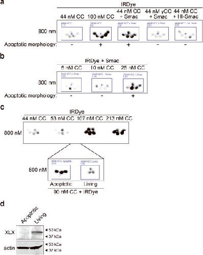 Figure 4. A cytochrome c threshold exists in oocytes and is lowered by Smac addition(A) Oocytes were microinjected with IRDye and either sub-threshold CC (44 nM), supra-threshold level of CC (107 nM), 44nM CC plus Smac protein, 44nM yCC plus Smac, or 44nM CC plus Smac that had been heat-inactivated by heating at 95°C for 5 minutes (HI-Smac) and then imaged after 40 minutes. Smac was injected to a concentration of 280 nM. Average oocyte fluorescence is displayed in Supplemental Figure 1i. (B) Low doses of CC were injected with the IRDye and Smac and imaged after 30 minutes. Average oocyte fluorescence is displayed in Supplemental Figure 1j. (C) Oocytes were injected with IRDye and increasing doses of CC and imaged after 45 minutes. Naive oocytes from the same batch were then injected with IRDye and 90nM CC, observed for apoptotic morphology and then 3 apoptotic and 3 living oocytes were imaged for fluorescence. Average oocyte fluorescence is displayed in Supplemental Figure 1k. (D) Lysates were prepared from the apoptotic and living oocyte groups described in C and then immunoblotted for XLX.