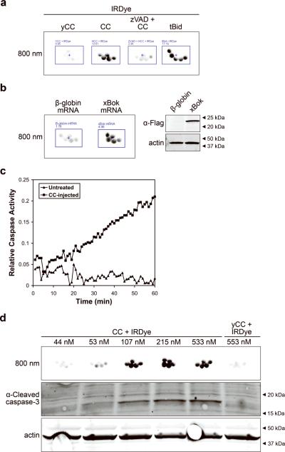 Figure 2. Oocyte fluorescence is due to activation of caspases(A) Oocytes were injected with the IRDye and either yCC (267 nM), CC (267 nM), CC (267 nM) + z-VAD-fmk (40 nM), or tBid (167 nM) and imaged after 1 hour. Average oocyte fluorescence is displayed in Supplemental Figure 1c. (B) Left, IRDye and 20 ng of either B-globin or flag-tagged Xenopus Bok (xBok) mRNA was injected into oocytes, allowed to express for 5 hours at room temperature and them imaged. Average oocyte fluorescence is displayed in Supplemental Figure 1d. Right, oocyte lysates immunoblotted with anti-flag antibody demonstrated xBok expression. (C) Cell-free lysates were prepared from untreated or CC-injected oocytes, and analyzed for caspase activity over time after the addition of the colorimetric caspase substrate Ac-DEVD-pNA. (D) Top, oocytes were injected with the IRDye and increasing doses of CC or yCC and imaged after 1 hour. Bottom, lysates prepared from these oocytes immunoblotted for active caspase 3.