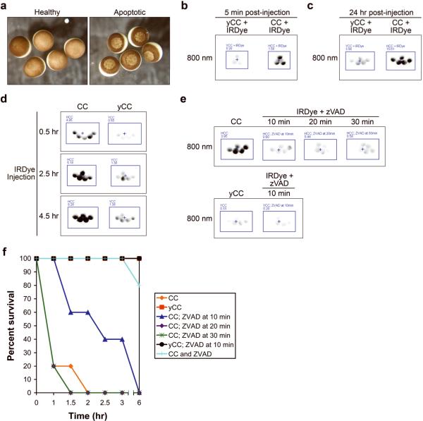 Figure 3. Caspases are rapidly activated in response to cytochrome c; caspases remain active for hours although their activity is only required for 10 minutes to ensure apoptosis(A) Oocytes were injected with yCC (healthy) or CC (apoptotic) at 106 nM, and photographed 3 hours later. (B) Oocytes microinjected with IRDye and either yCC or CC at 67 nM were imaged for fluorescence after 5 minutes, demonstrating rapidity of the signal in response to even small amounts of CC. Average oocyte fluorescence is displayed in Supplemental Figure 1e. (C) Oocytes microinjected with IRDye and either yCC or CC at 533 nM were imaged after 24 hours, demonstrating a stable, selective induction of signal in CC-injected oocytes even at high yCC concentrations. Average oocyte fluorescence is displayed in Supplemental Figure 1f. (D) Oocytes microinjected with either CC or yCC at 80 nM at t=0 were then injected with IRDye at various times indicated, and imaged 30 minutes later. Average oocyte fluorescence is displayed in Supplemental Figure 1g. (E) CC or yCC was microinjected at 533 nM at t=0, then IRDye and z-VAD-fmk (70 nM) were injected at times indicated and then imaged 30 minutes later. Note z-VAD-fmk-mediated signal inhibition even at high concentrations of CC. Average oocyte fluorescence is displayed in Supplemental Figure 1h. (F) Survival curve based on observation of apoptotic morphology of oocytes that had been treated as described in E.