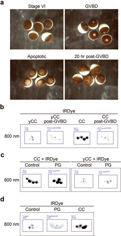 Figure 5. Progesterone-induced oocyte maturation decreases sensitivity to cytochrome c(A) Reflected light images of healthy stage VI oocytes (top left), progesterone-treated oocytes demonstrating GVBD (top right), cytochrome c-injected apoptotic oocytes (bottom left), and deteriorating un-fertilized oocytes 20 hours after GVBD (bottom left). (B) Oocytes were treated with progesterone and allowed to mature until GVBD, approximately 5 hours. Post-GVBD or control-treated oocytes were then injected with the IRDye and yCC or CC (at 67 nM), and then imaged after 1 hour. Average oocyte fluorescence is displayed in Supplemental Figure 1l. (C) Oocytes were treated with progesterone for 30 minutes before injecting them or control-treated oocytes with the IRDye and yCC or CC (at 533 nM), and imaged after 1 hour. Average oocyte fluorescence is displayed in Supplemental Figure 1m. (D) Oocytes were treated with progesterone or control, microinjected with IRDye after GVBD and then imaged for fluorescence 24 hours after progesterone treatment. Oocytes injected at the same time with IRDye and CC at 67 nM were included as a positive control. Average oocyte fluorescence is displayed in Supplemental Figure 1n.