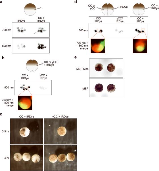 Figure 6. Cytochrome c injection of a single blastomere causes death of the entire embryo(A) Fertilized eggs were injected prior to the first cell cleavage with the IRDye or IRDye and CC and then imaged during the 2-cell stage. Autofluorescence is shown in the 700 nm channel and caspase activity in the 800 nm channel. (B) One blastomere of a two-cell embryo was microinjected with IRDye and either CC or yCC (at 270 nM)., and imaged after 30 minutes (approximately 3 hours after fertilization). (C) Embryos from B were photographed 4 hours after fertilization. (D) Embryos were injected as indicated and then imaged 30 minutes later (approximately 3 hours after fertilization). (E) Photograph of Mos-arrested embryos, with left half arrested while right half of embryos continue.