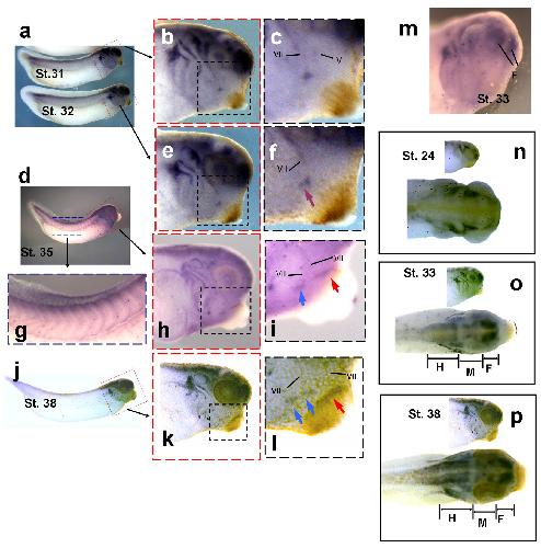 Supplemental Fig. S3. MyoX expression on cranial nerve V and VII, somite, and brain. A: Expression of MyoX at St. 31 in cranial nerve V and VII. F: Cranial nerve VII starts branching at St. 32 (purple arrow). I,L: The ascending (red arrow) and descending (blue arrow) branches of VII become prominent at St. 35. The ascending branch approaches the anteriororsal aspect of the cement gland and reaches there at St. 38 MyoX expression demarcates nerve VII at this stage. D,G: Somites express MyoX throughout tail bud stages. M: MyoX is expressed in all brain regions. For anatomy of cranial nerves and brain see (Honore and Hemmati-Brivanlou, 1996; Nagata et al., 2003; Huang et al., 2007). F, forebrain; M, midbrain; H, hindbrain.